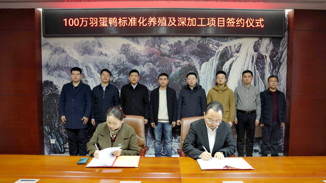 总投资5.3亿元项目签约落户德安 来源: 发布时间:2026-01-20 分享到 分享到: 1月15日,总投资5.3亿元的100万羽蛋鸭标准化养殖及深加工项目签约落户德安县,市政府驻汉办副主任胡斌,德安县政府副县长金鹏出席签约仪式。德安县政府副县长郑鹏代表政府与企业代表签约。据悉,100万羽蛋鸭标准化养殖及深加工项目总投资5.3亿元,分两期建设,一期蛋鸭养殖项目租赁德安县磨溪乡南田村集体土地,租赁面积约105亩,预计实现年产值2.5亿元;二期鸭肉鸭蛋深加工项目位于德安县工业园区内,拟用地面积约50亩,预计实现年产值4亿元。 【打印正文】